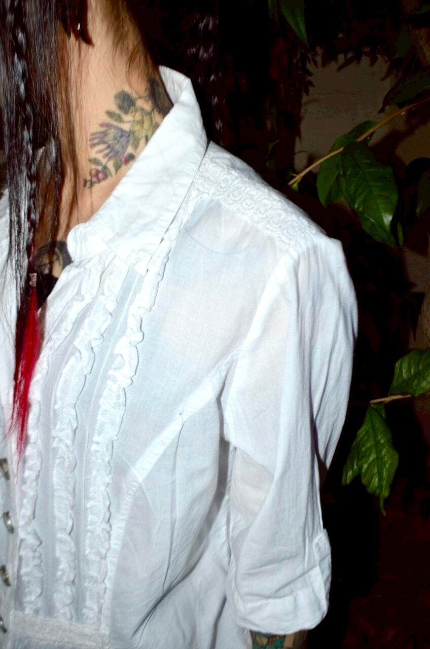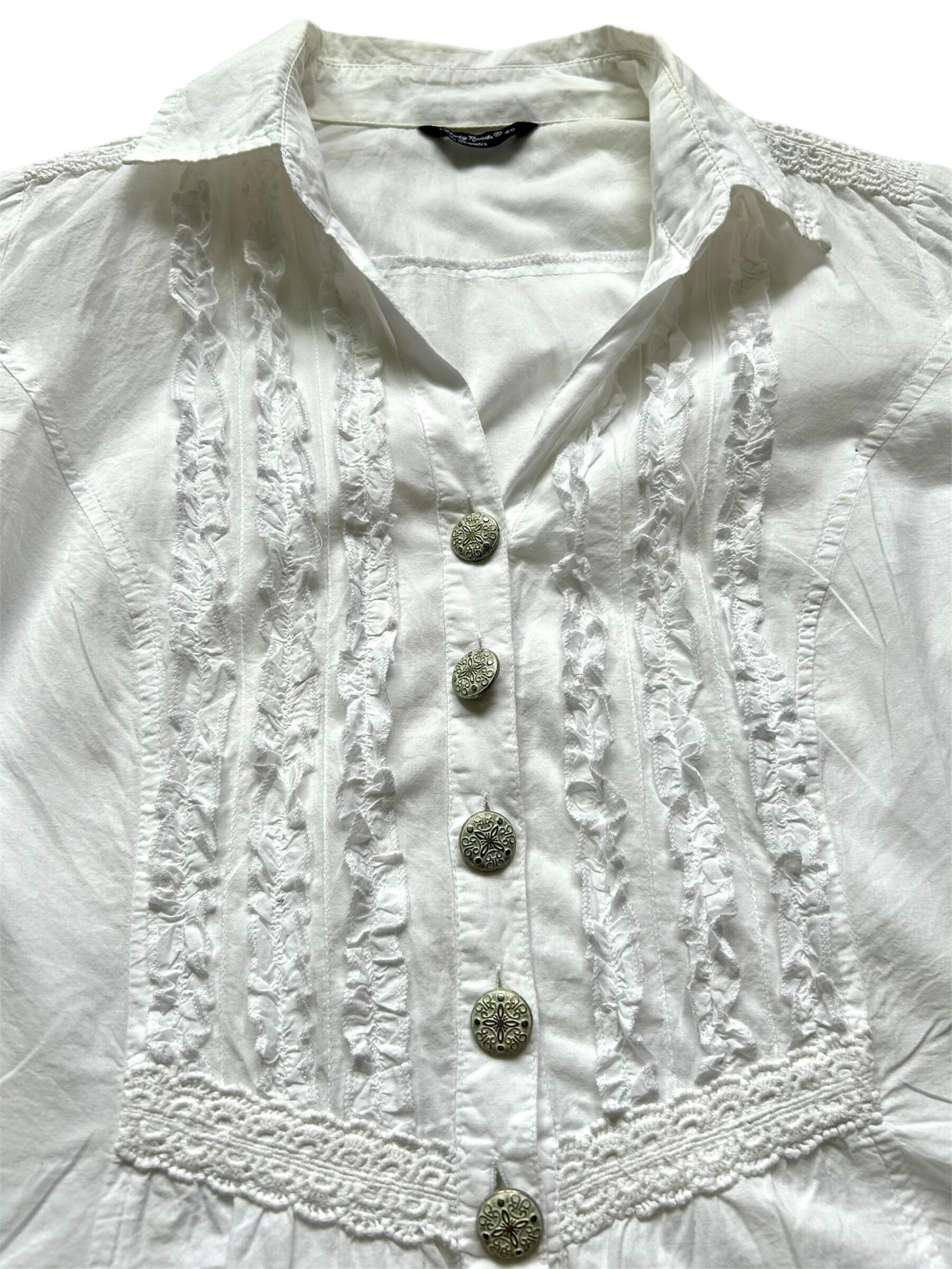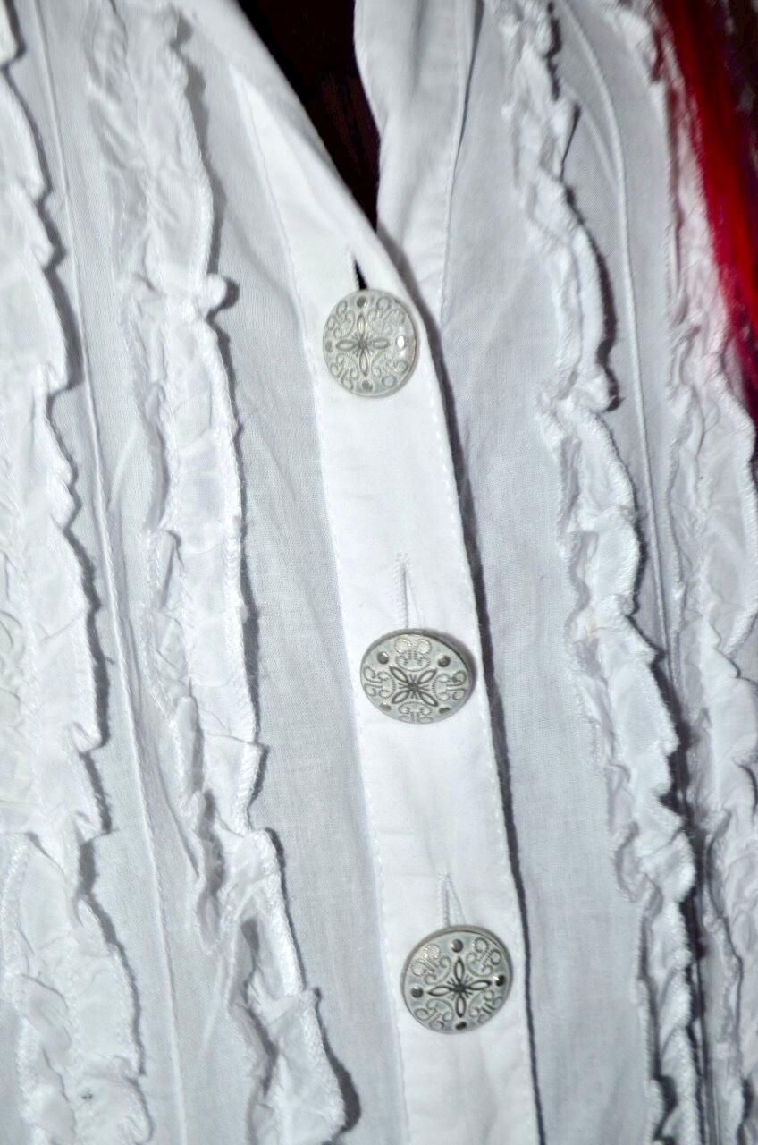 胸元だけに施されたフリルデザインと重厚なボタン、肩や腰辺りには刺繍レースが目を引きます。