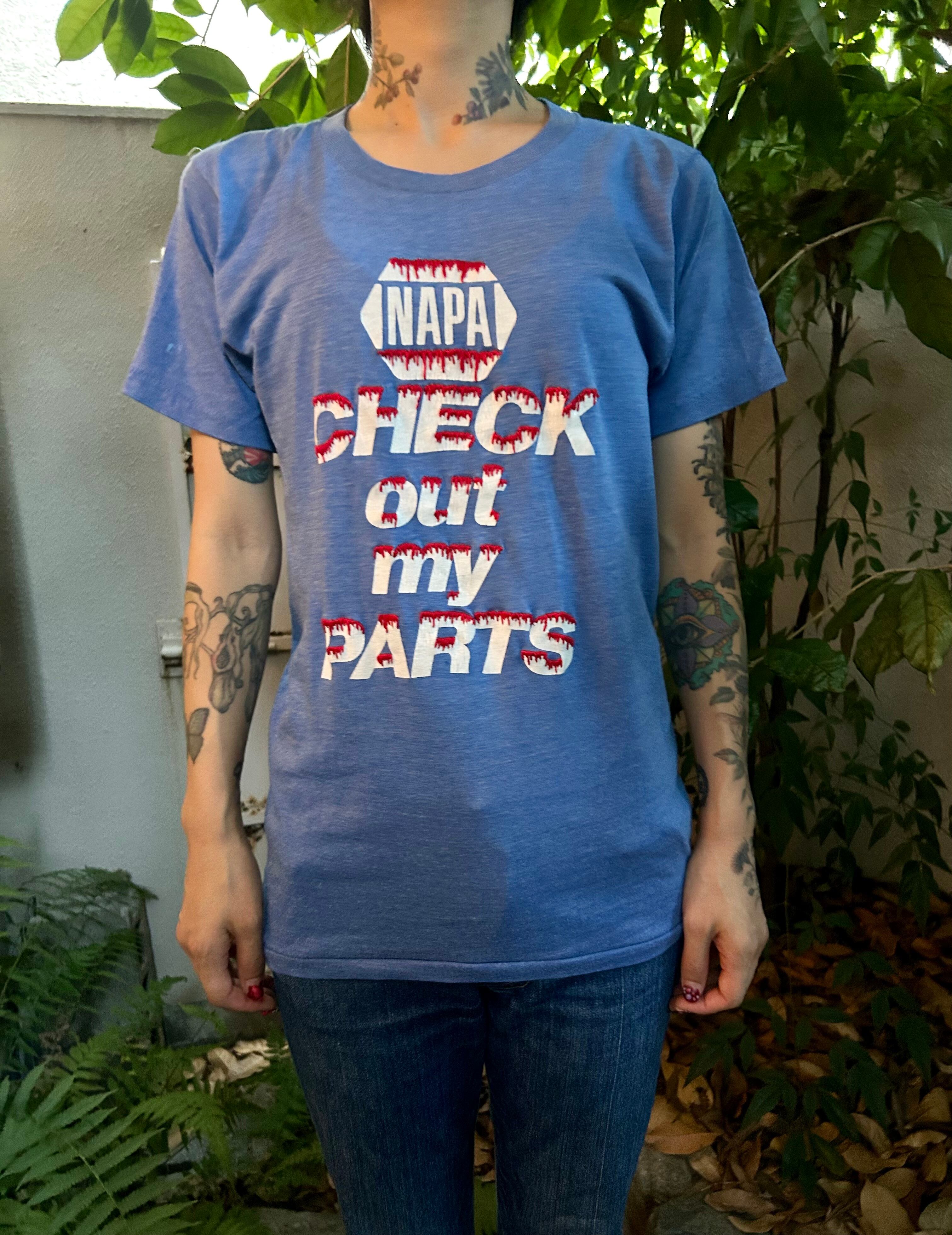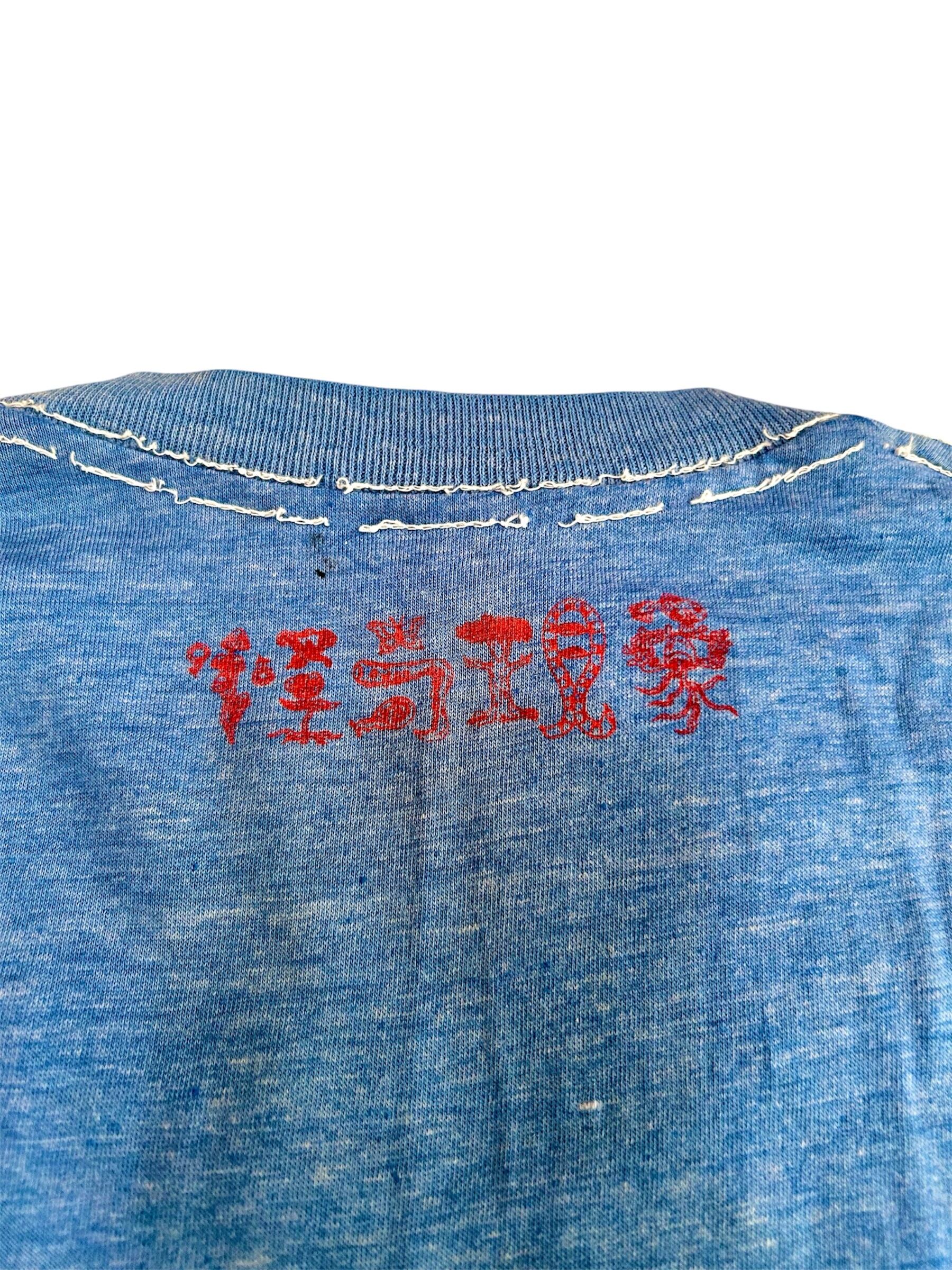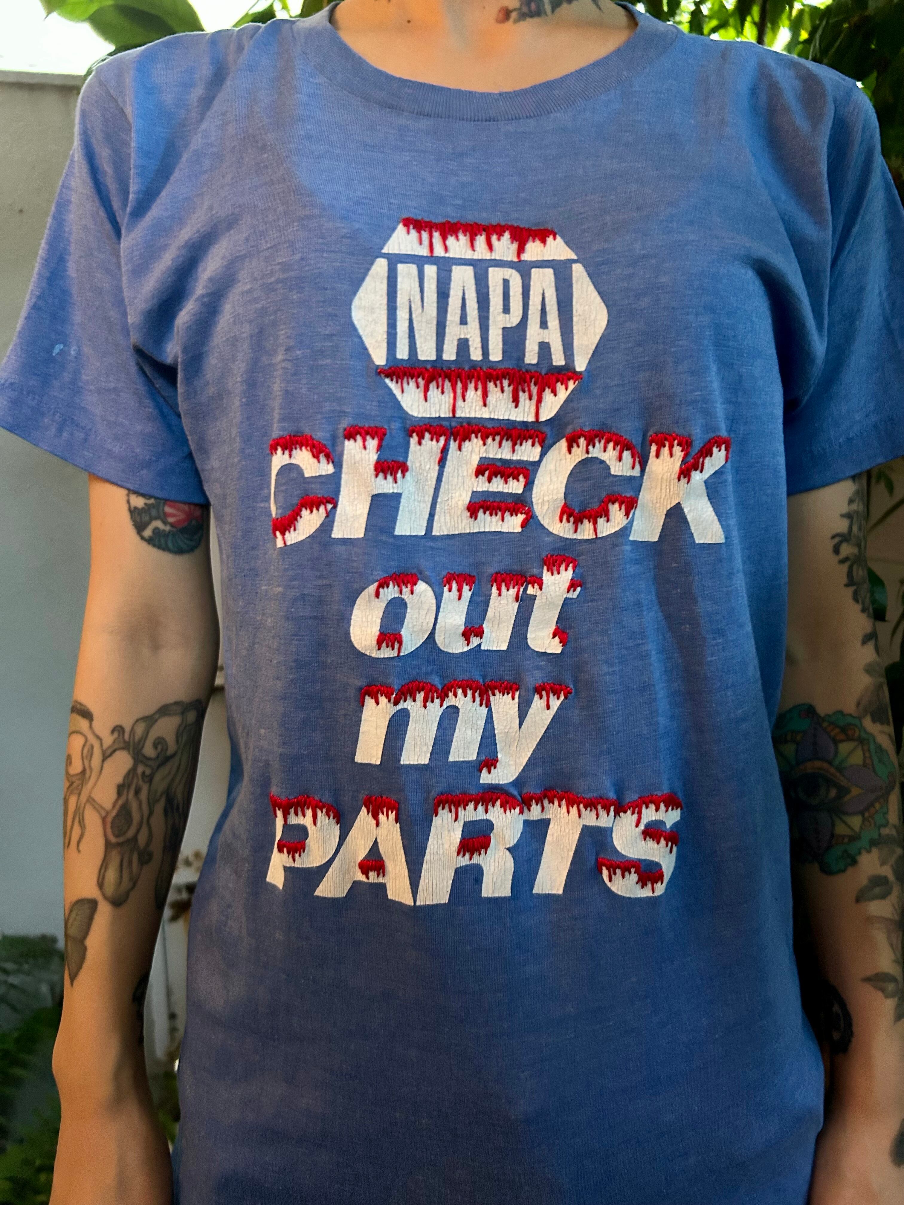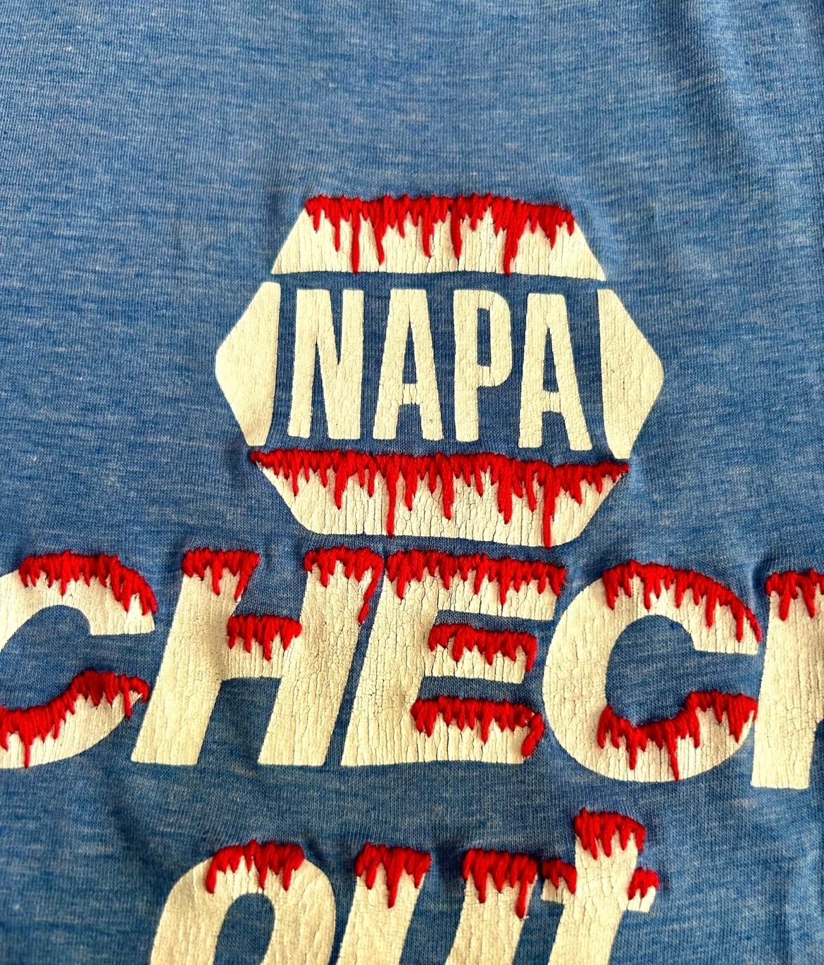 古着のTシャツを使い、元々のプリントを生かしながらホラーの雰囲気にリメイクしました。