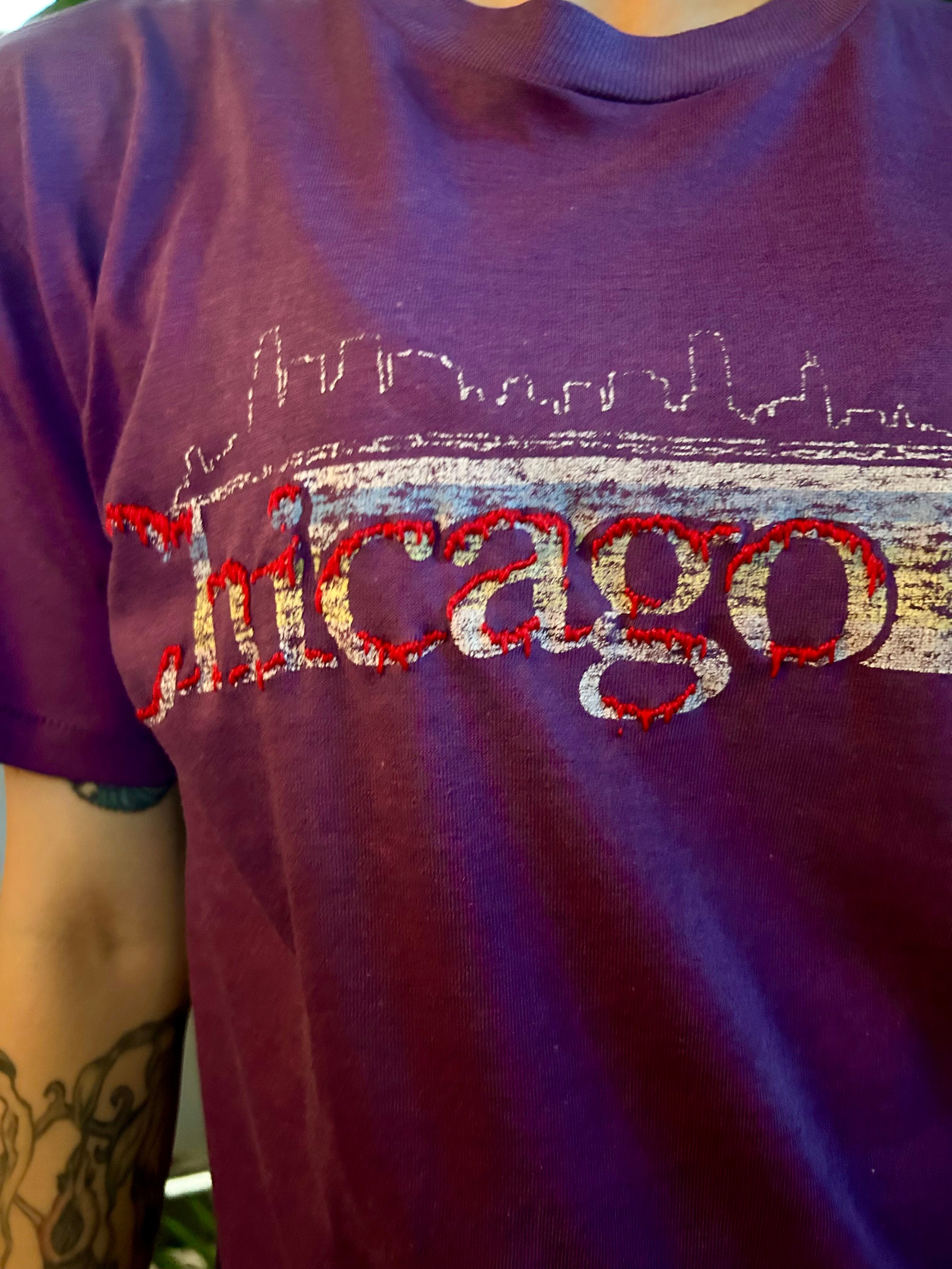古着のTシャツを使い、元々のプリントを生かしながらホラーの雰囲気にリメイクしました。