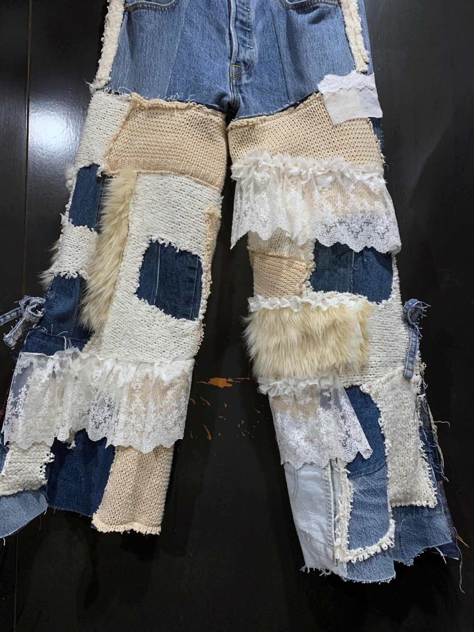 ニット、ファー、レース、デニム生地を組み合わせたパンツ