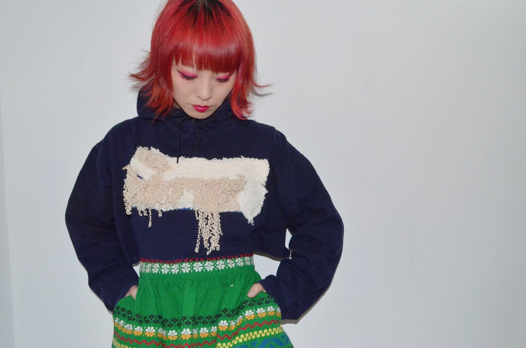 スウェットの真ん中が寂しくて、ニット素材を適当に縫っていたら地層みたいなデザインになっていました。偶然の産物です。