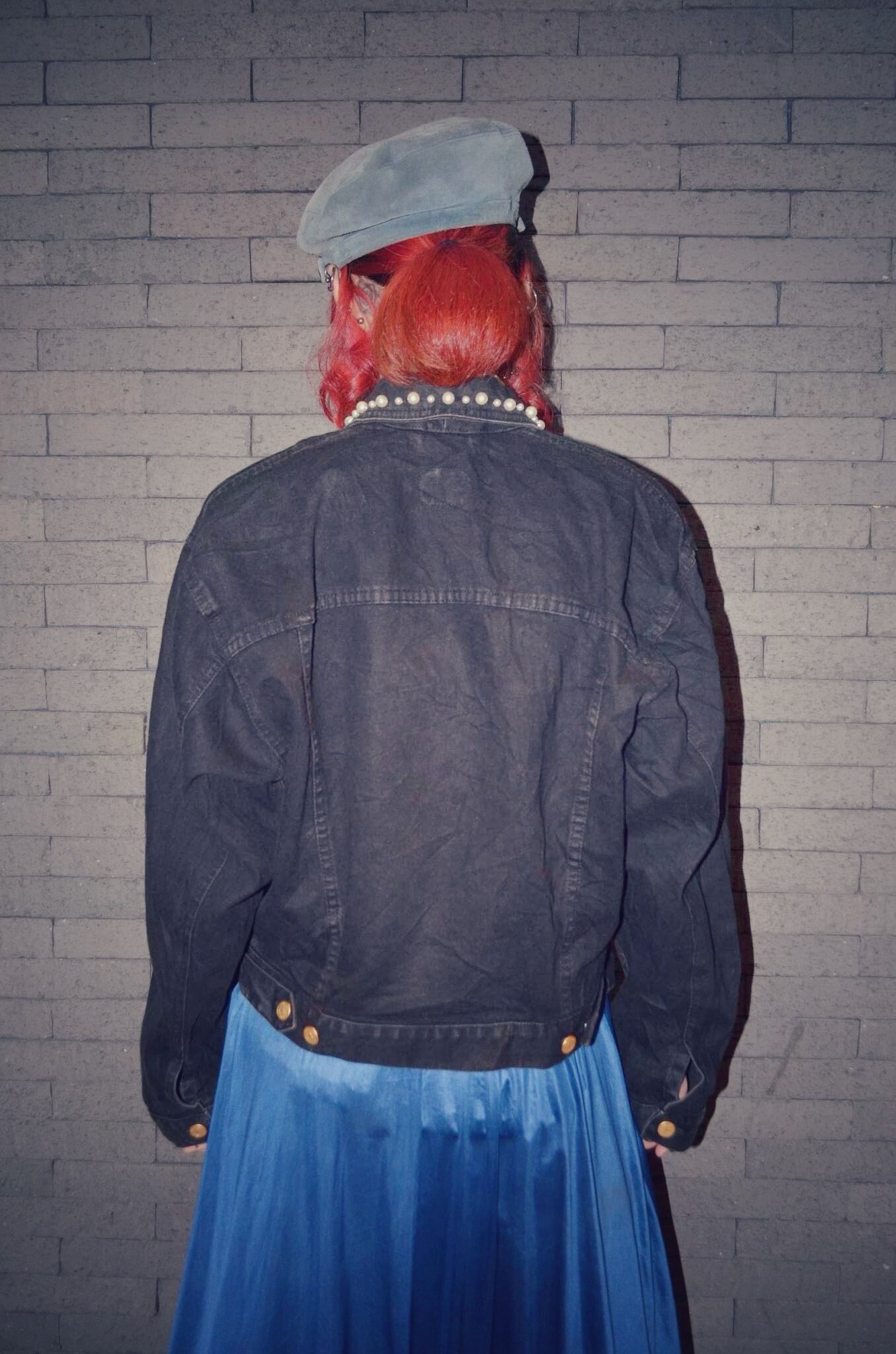 全体のシルエットは野暮ったくメンズライクなのですがパールがあることで女性らしい雰囲気に。