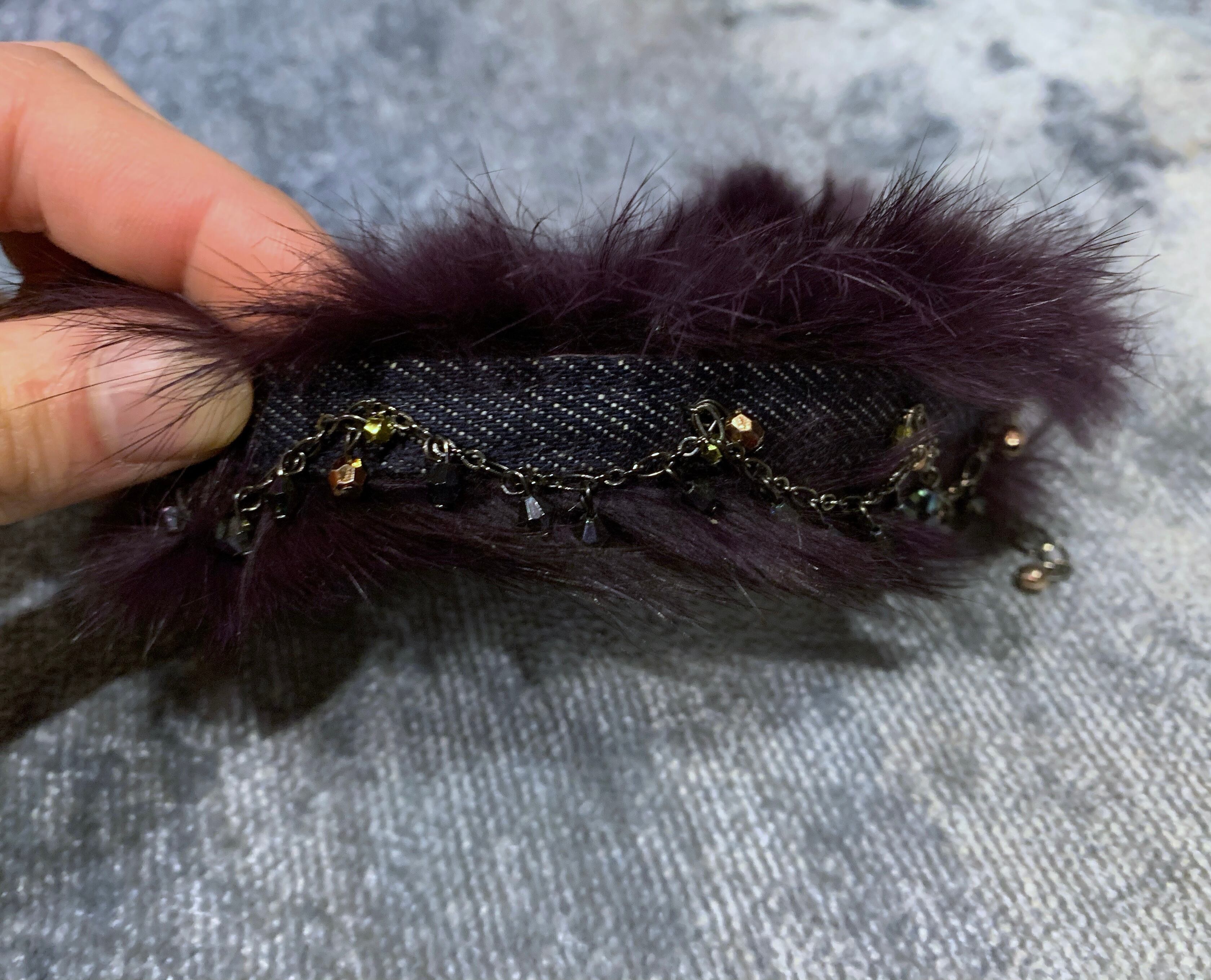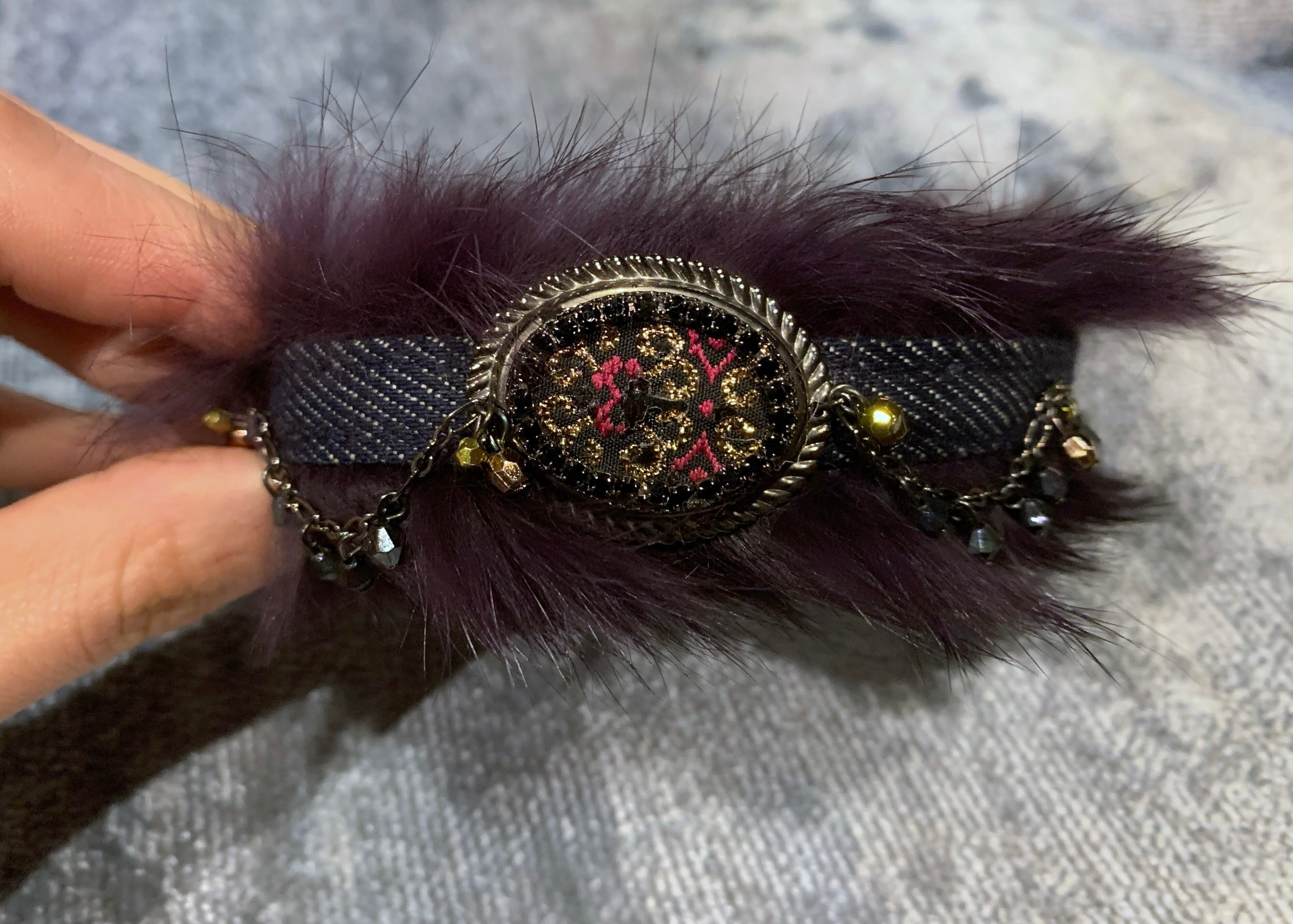 紫ファーとデニム素材、垂れ下がるビーズのチャームがかわいいチョーカー
