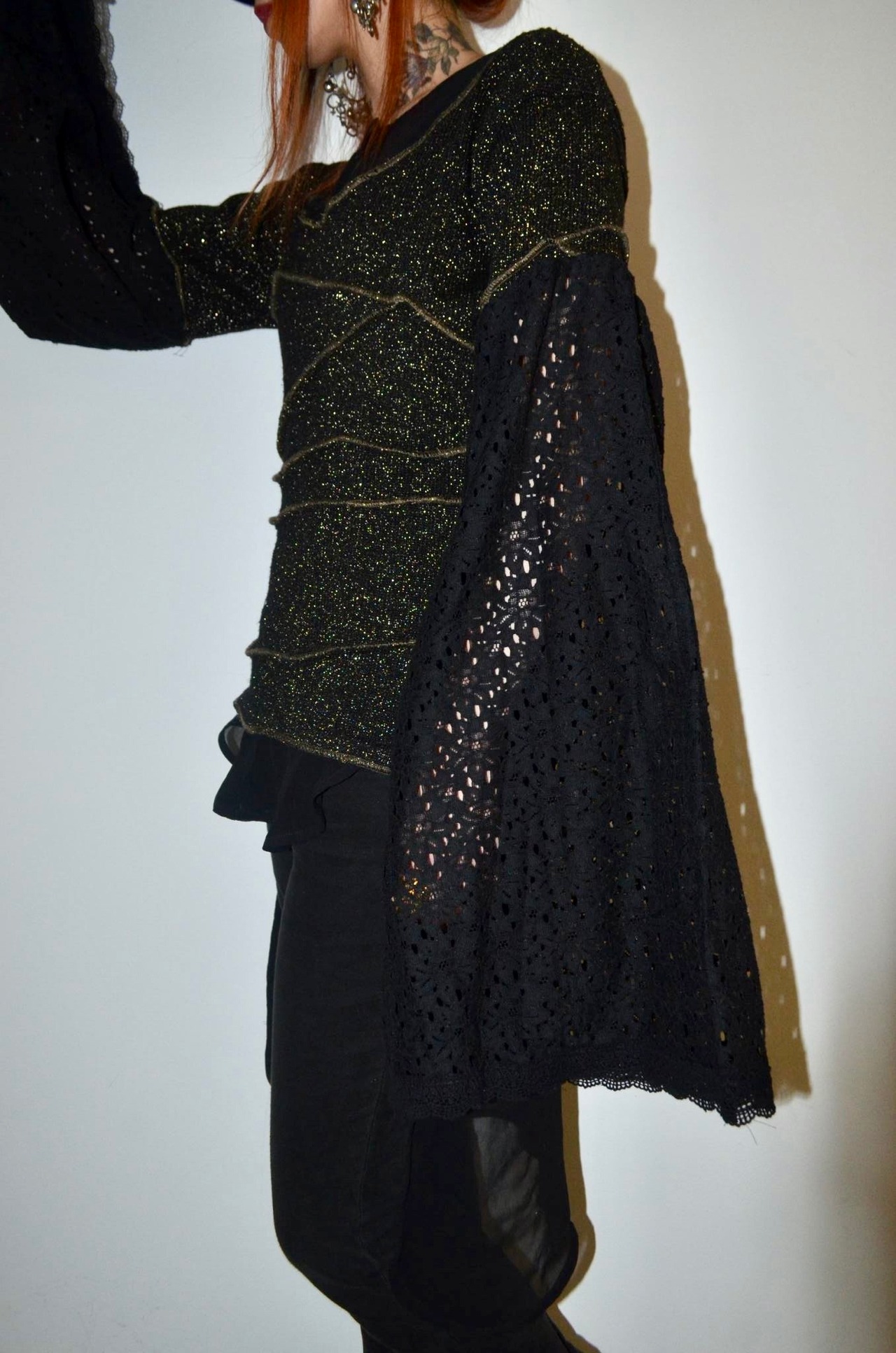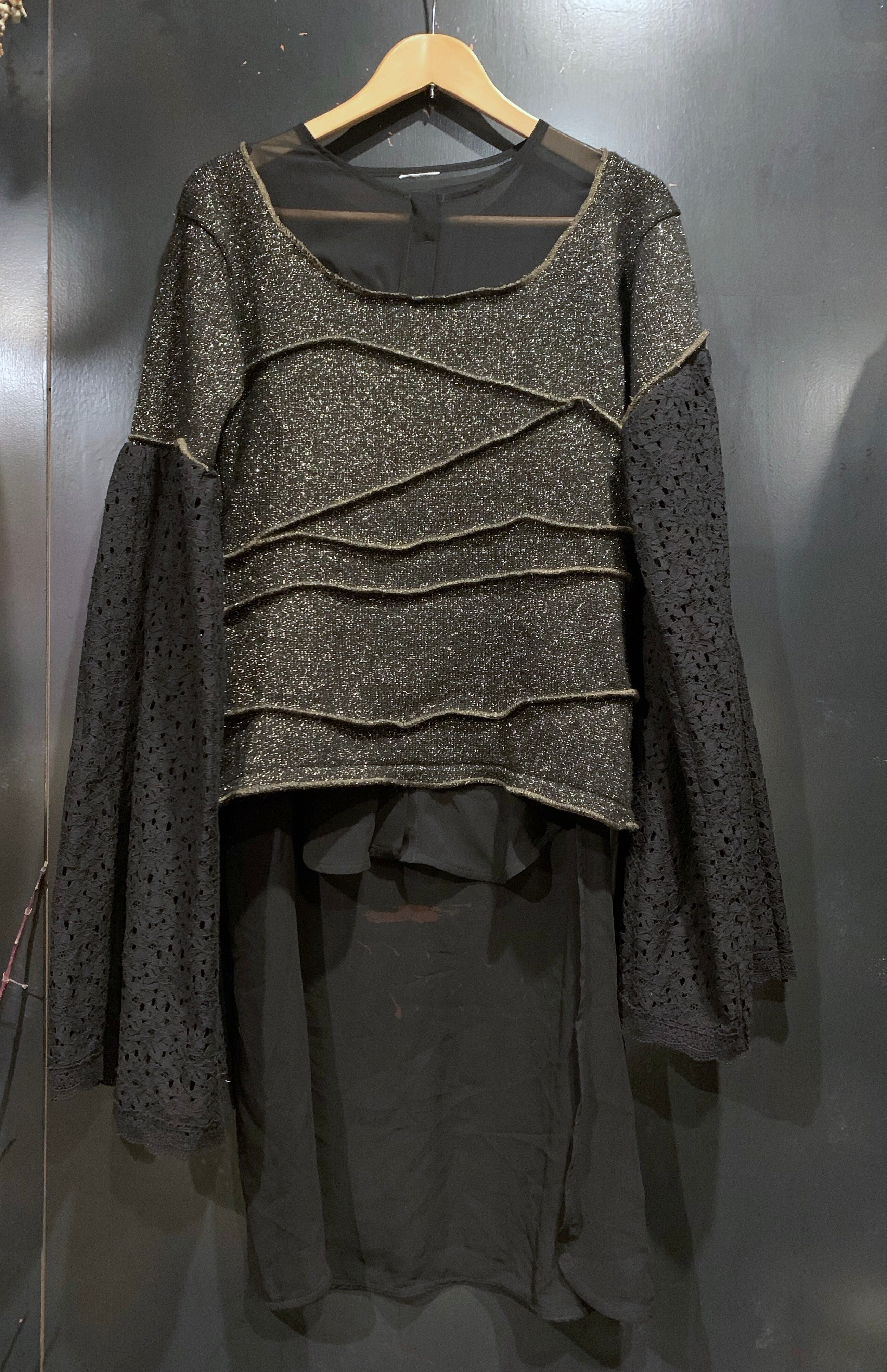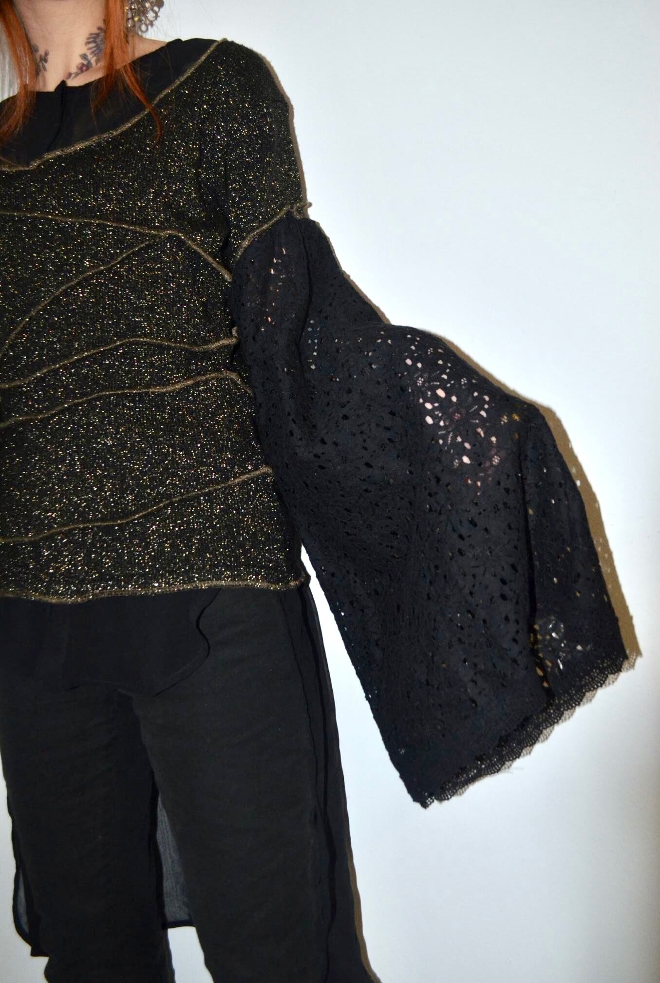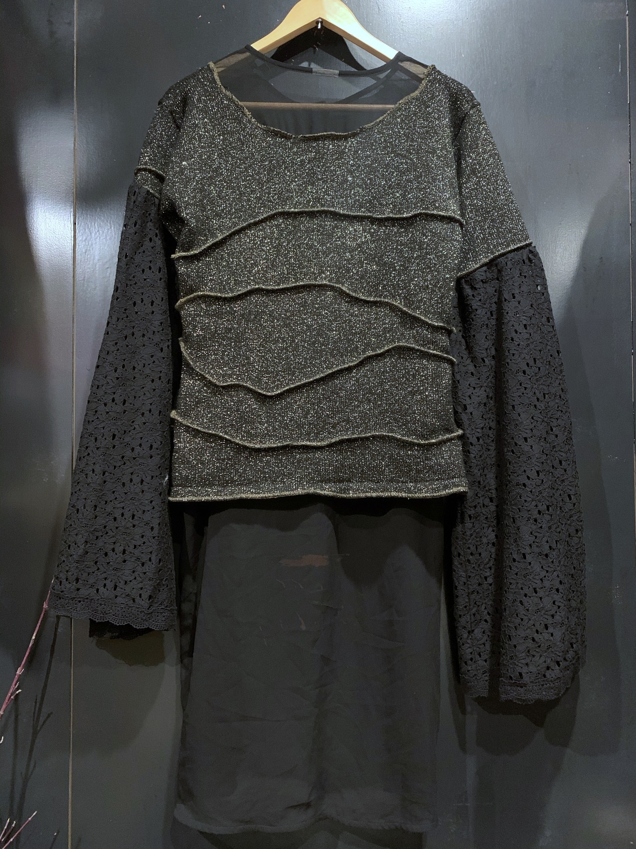 シンプルなラメニットをデザインニットに変え、半袖にした後、レース素材のスカートを使用し超幅広長袖にしました。