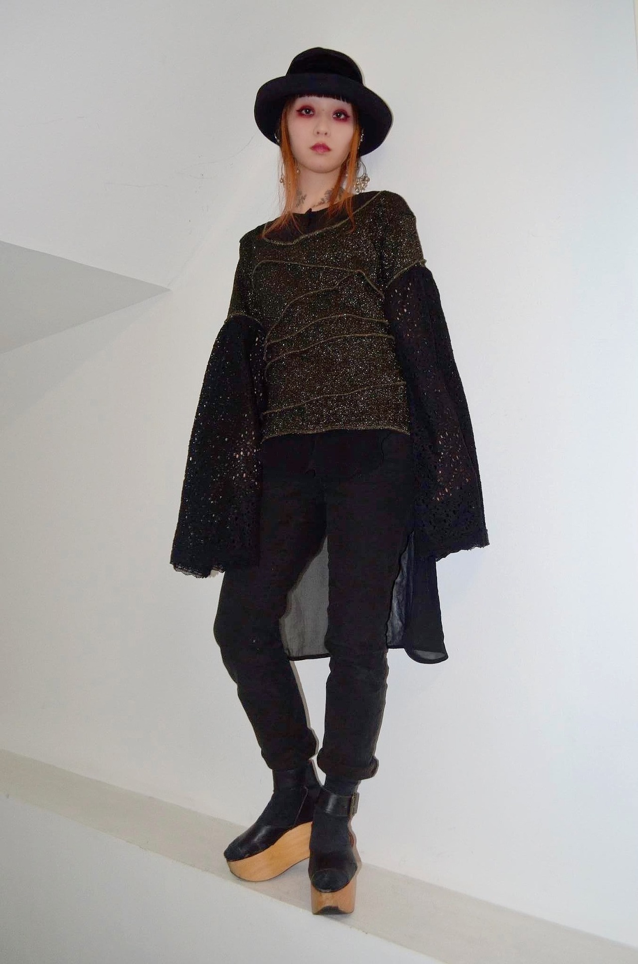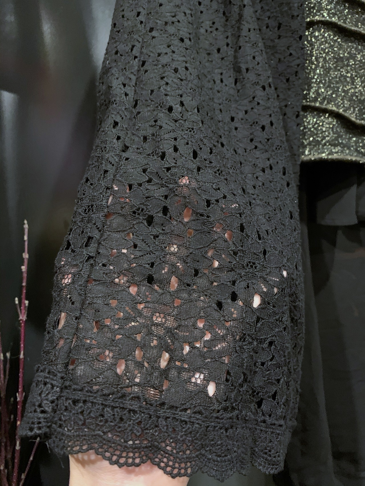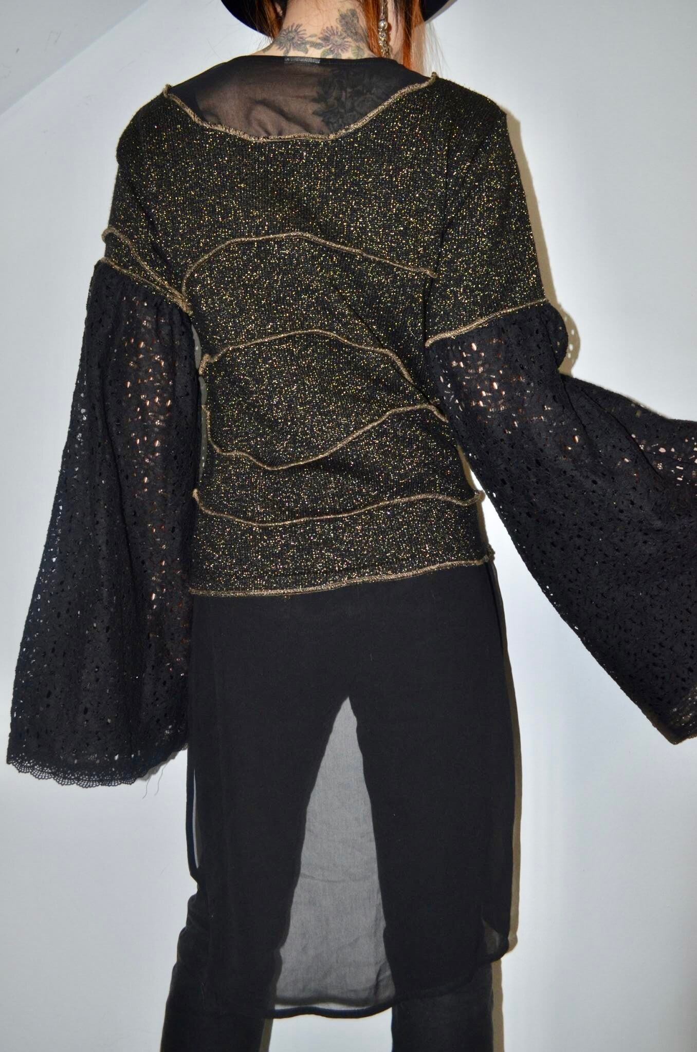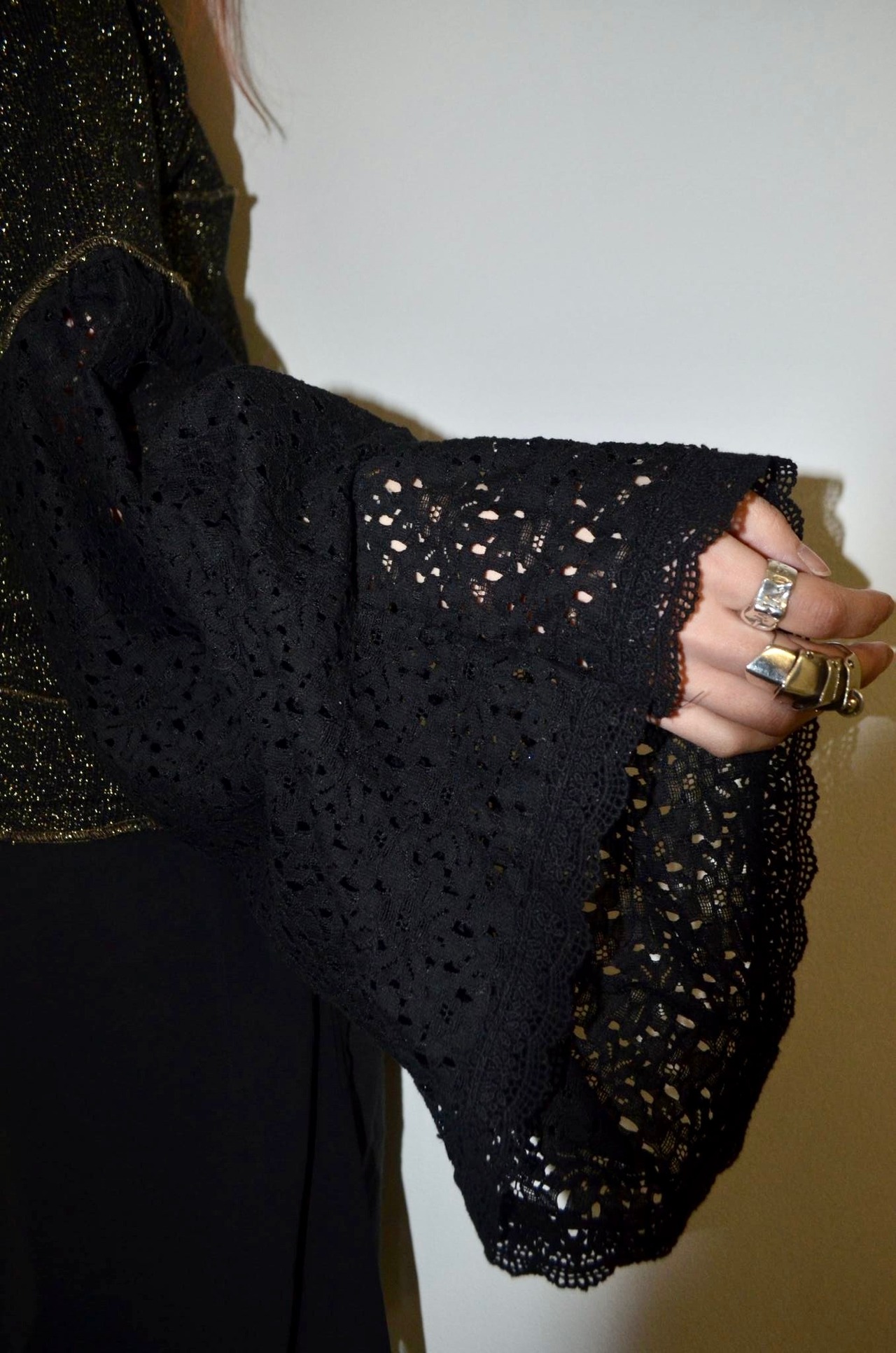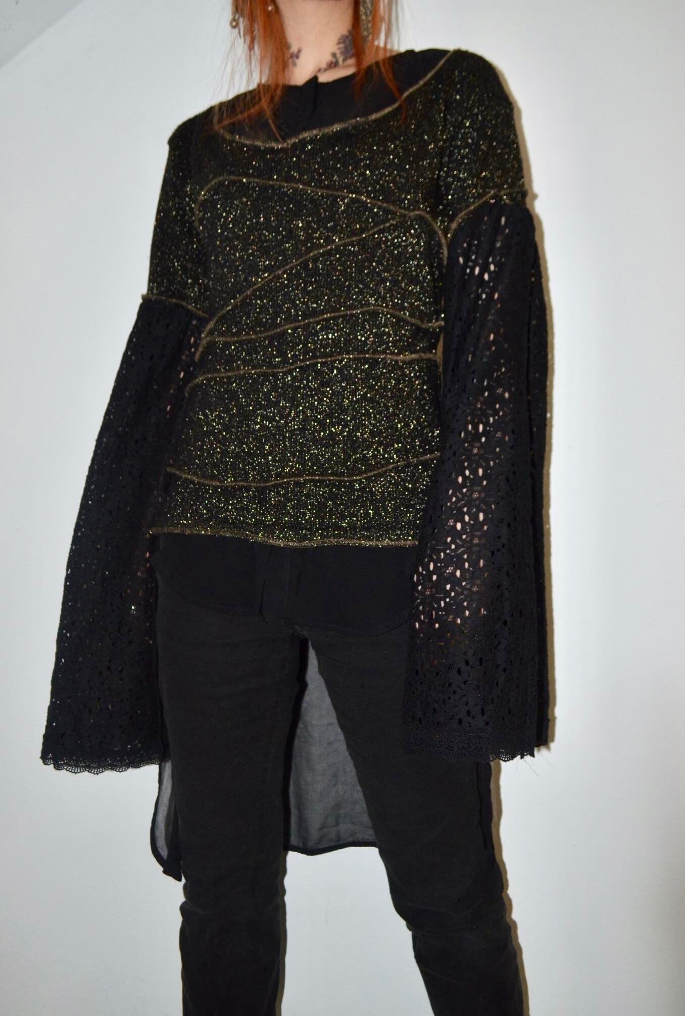 シンプルなラメニットをデザインニットに変え、半袖にした後、レース素材のスカートを使用し超幅広長袖にしました。