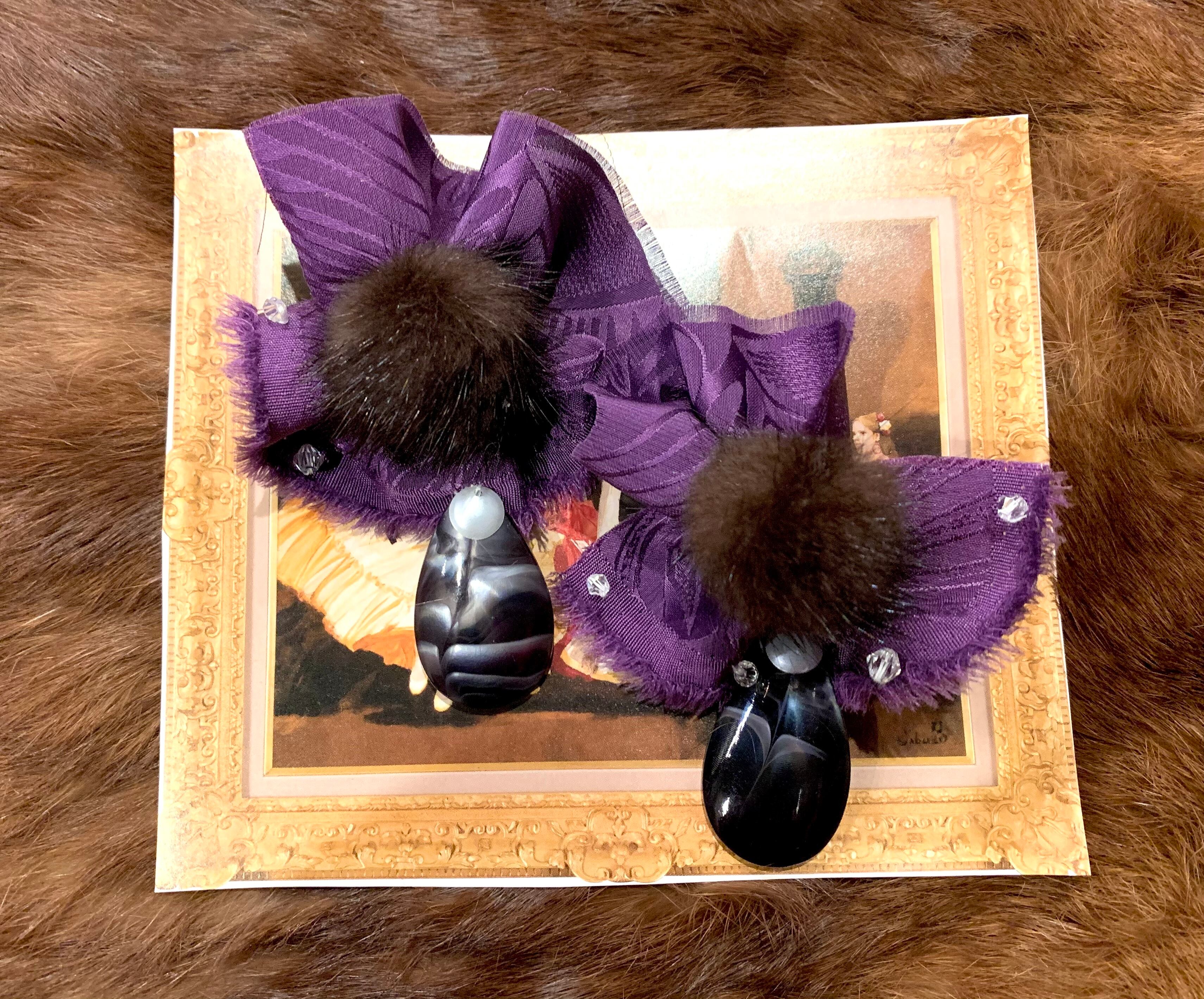 スカーフの生地、ビーズやファー等を組み合わせて可愛くしました。