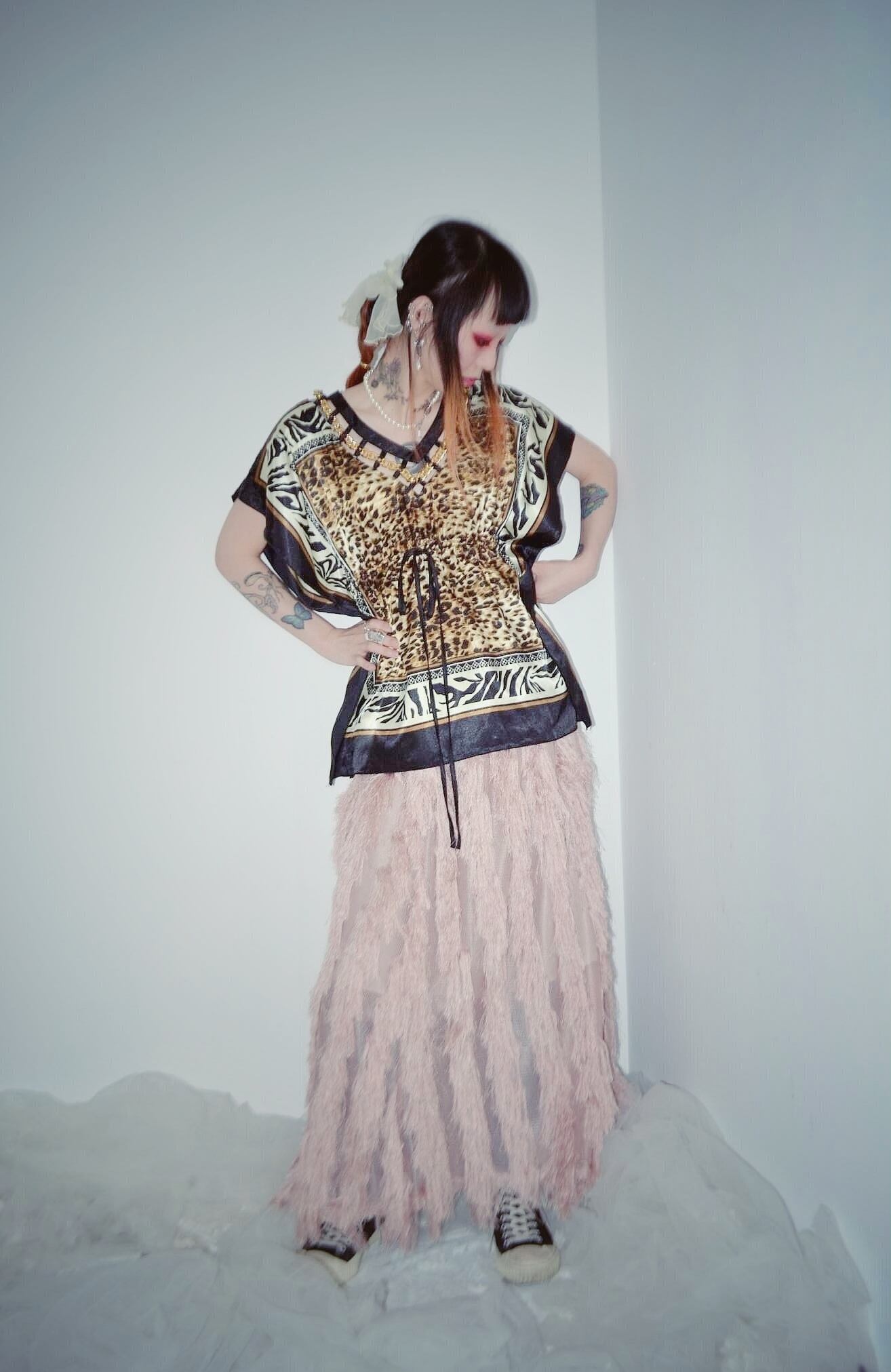 アニマル柄のスカーフを2枚組み合わせて作られた様なデザイントップス