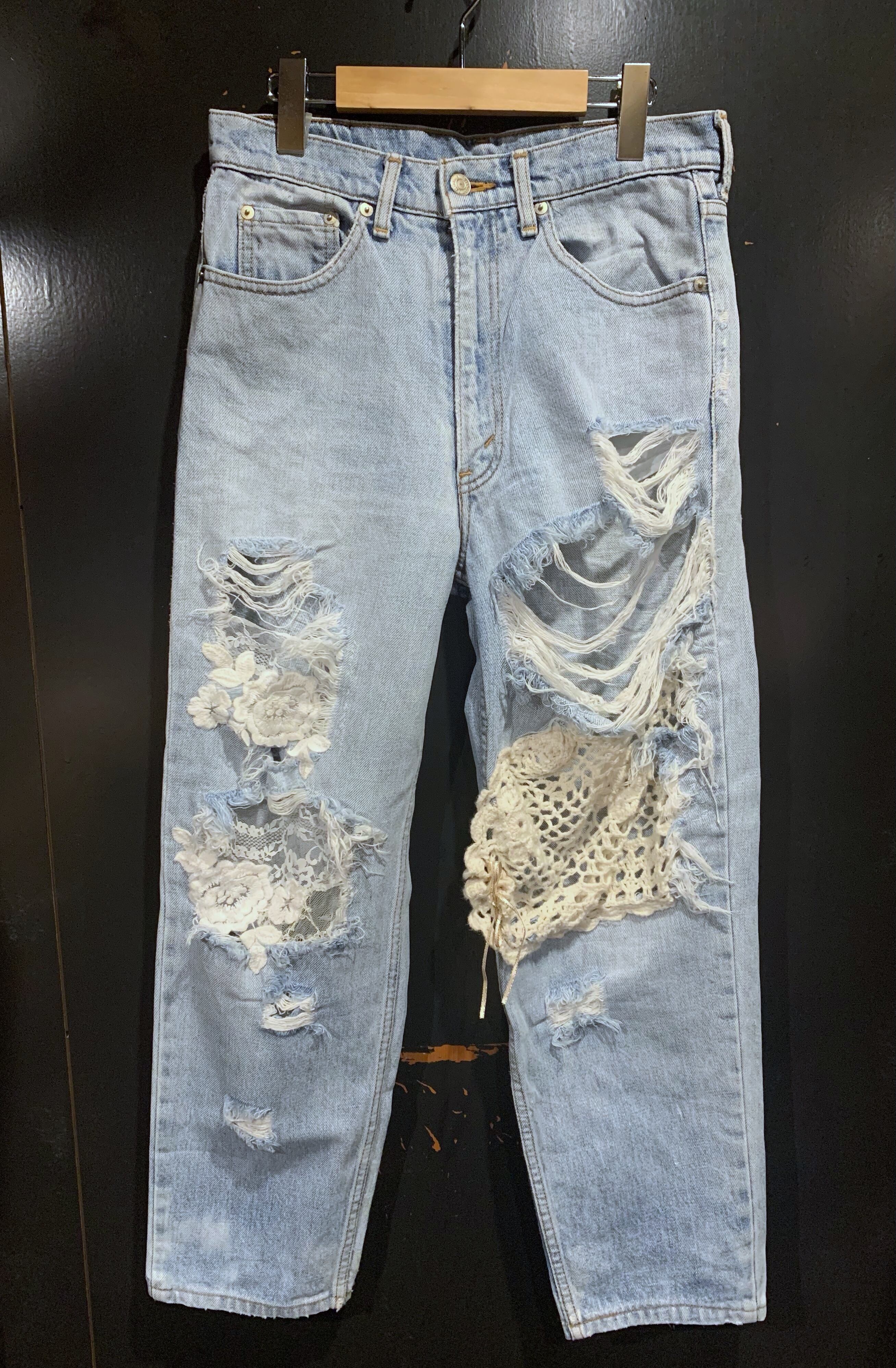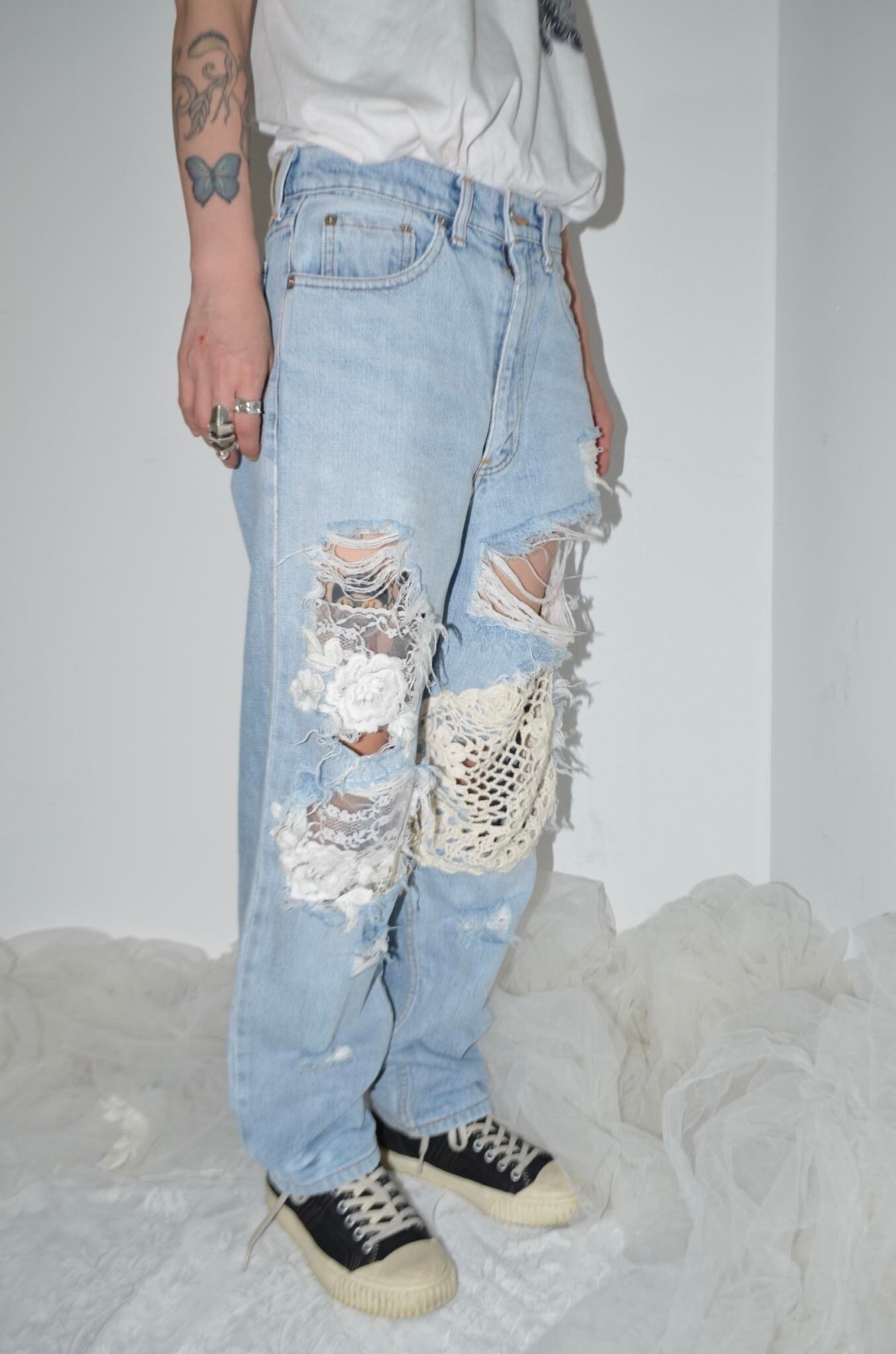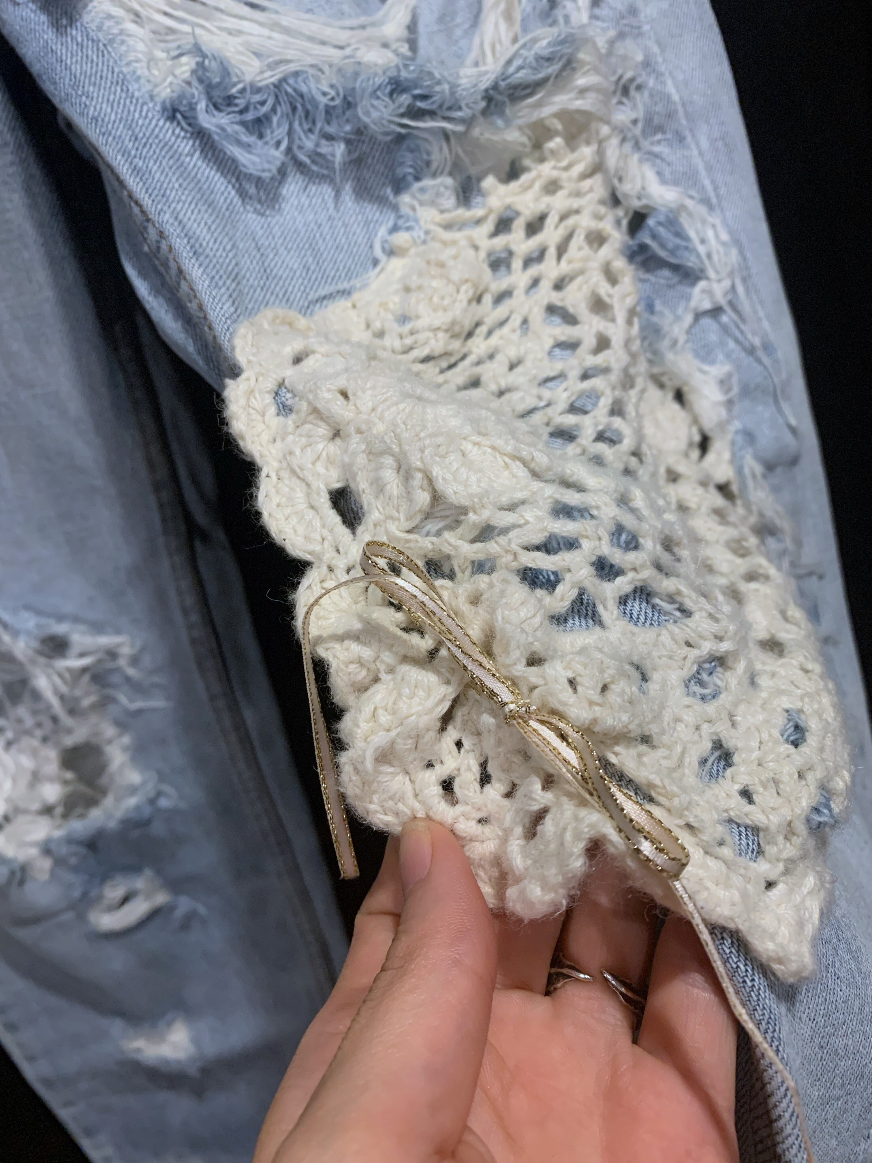 レースや鍵編み等を使い、大きくクラッシュした部分を利用しデザインになる様埋めてみました。