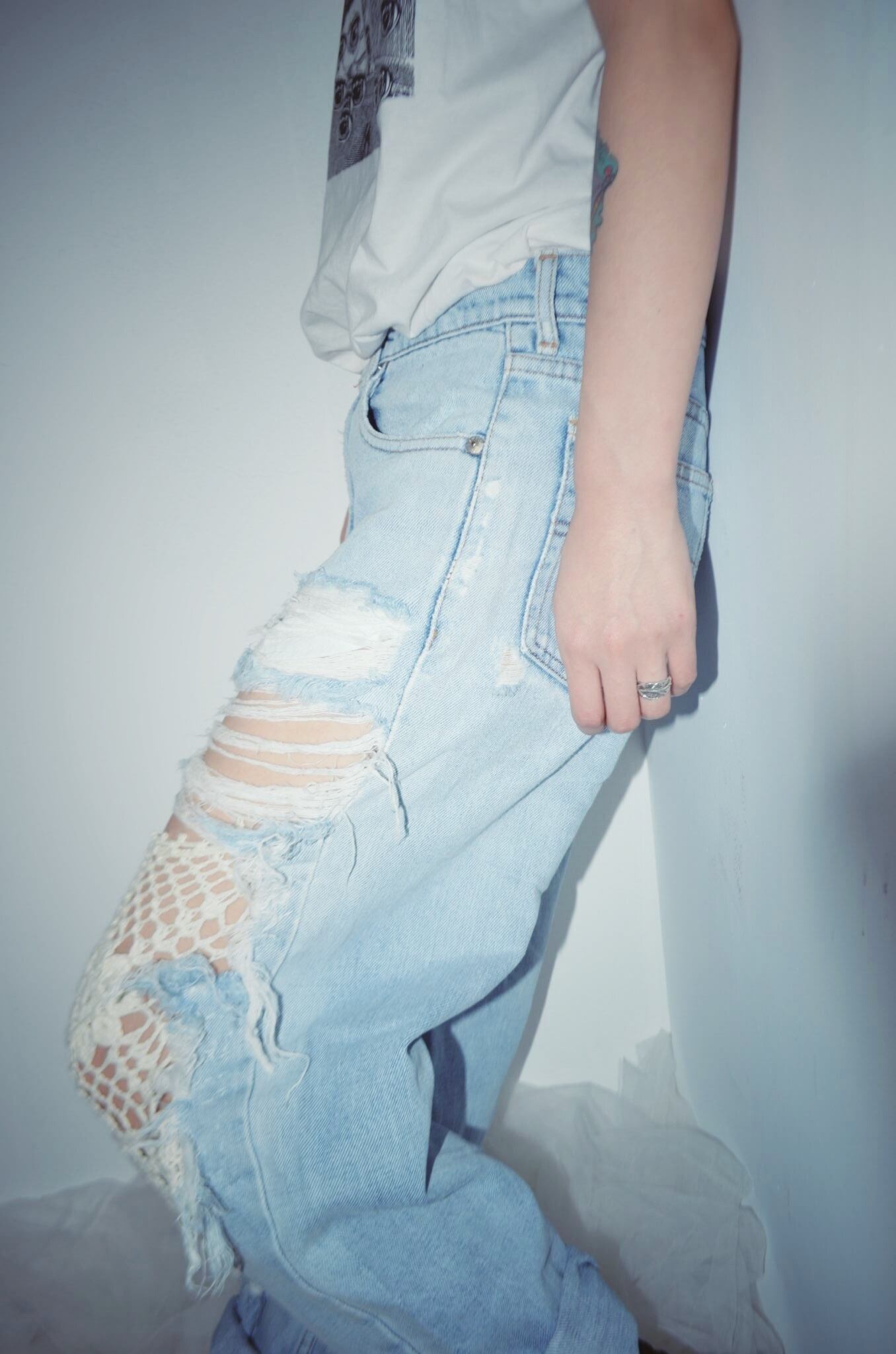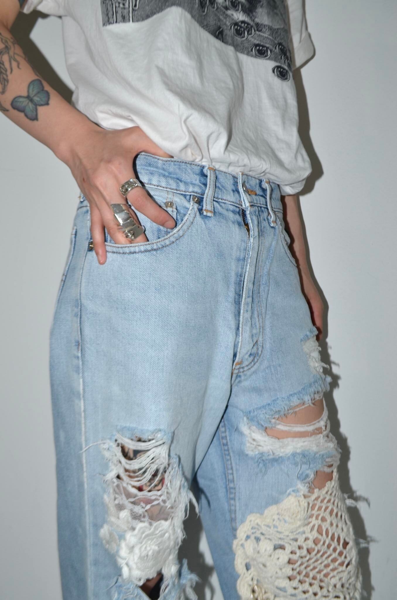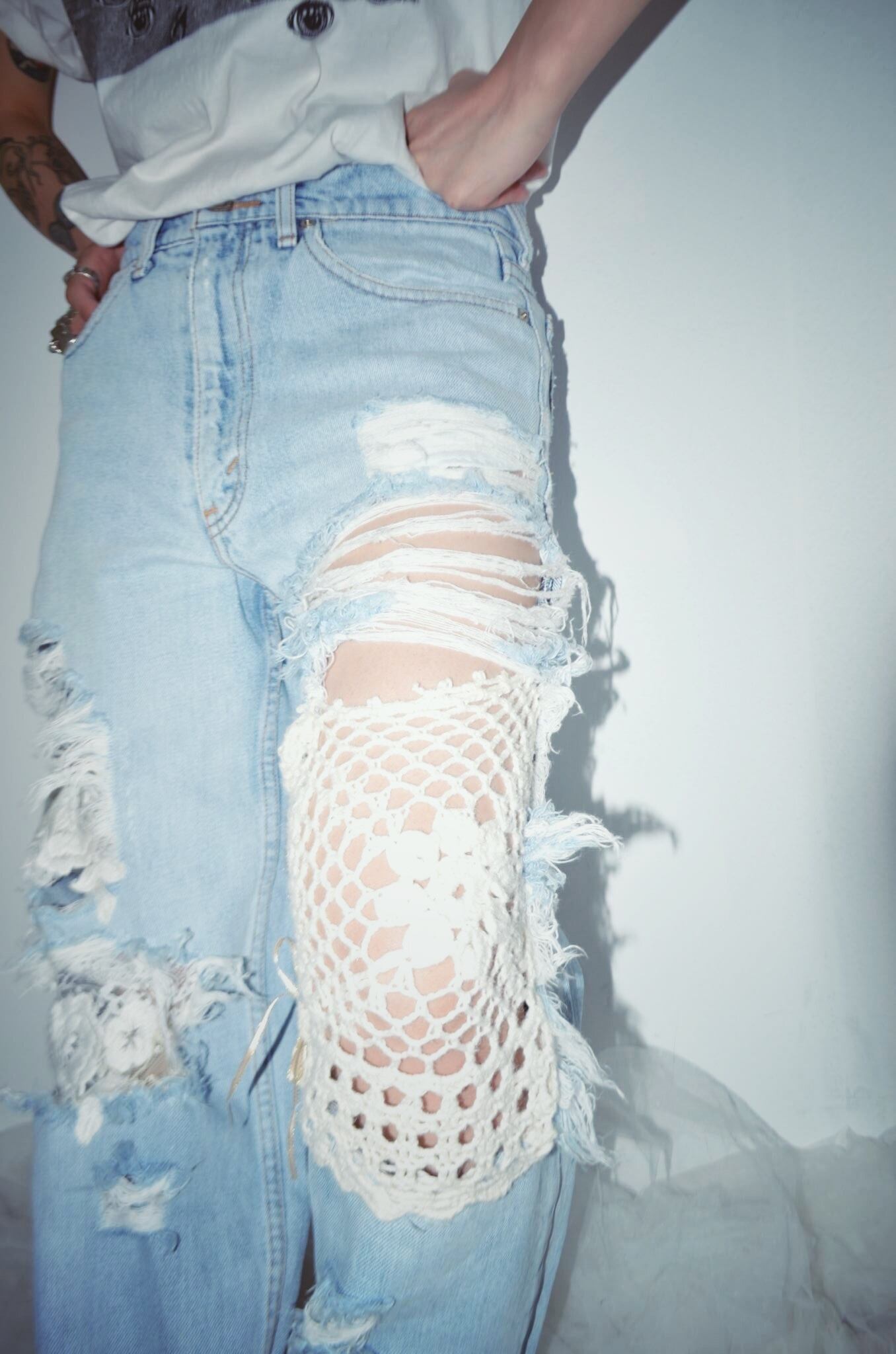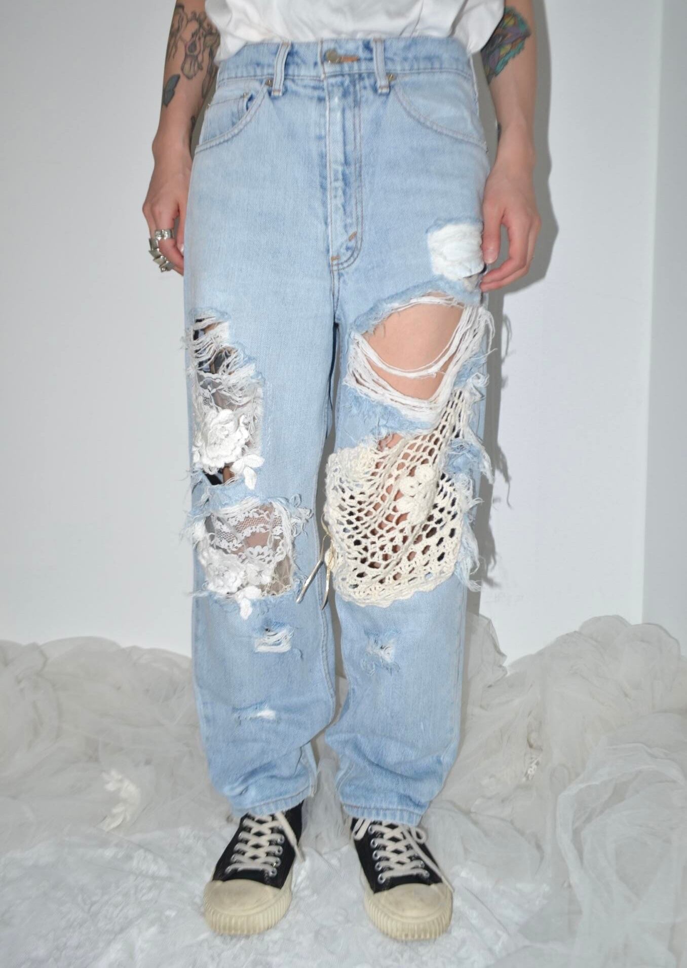 レースや鍵編み等を使い、大きくクラッシュした部分を利用しデザインになる様埋めてみました。