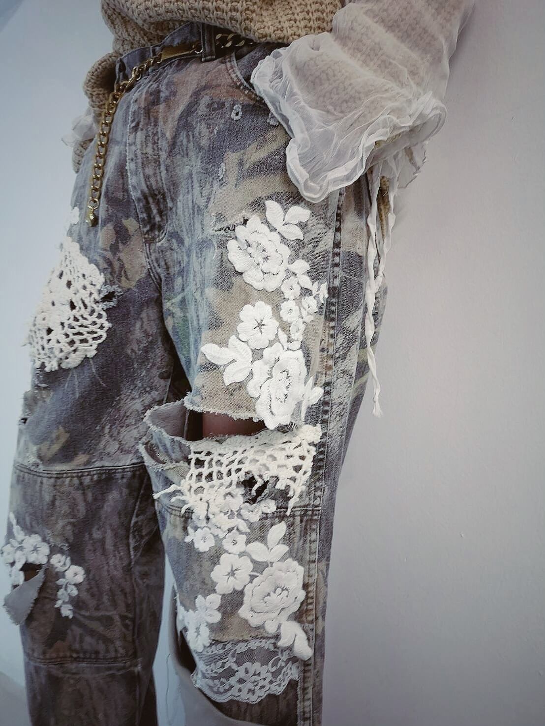 レースや鍵編み等を使い、大きくクラッシュした部分を利用しデザインになる様埋めてみました。