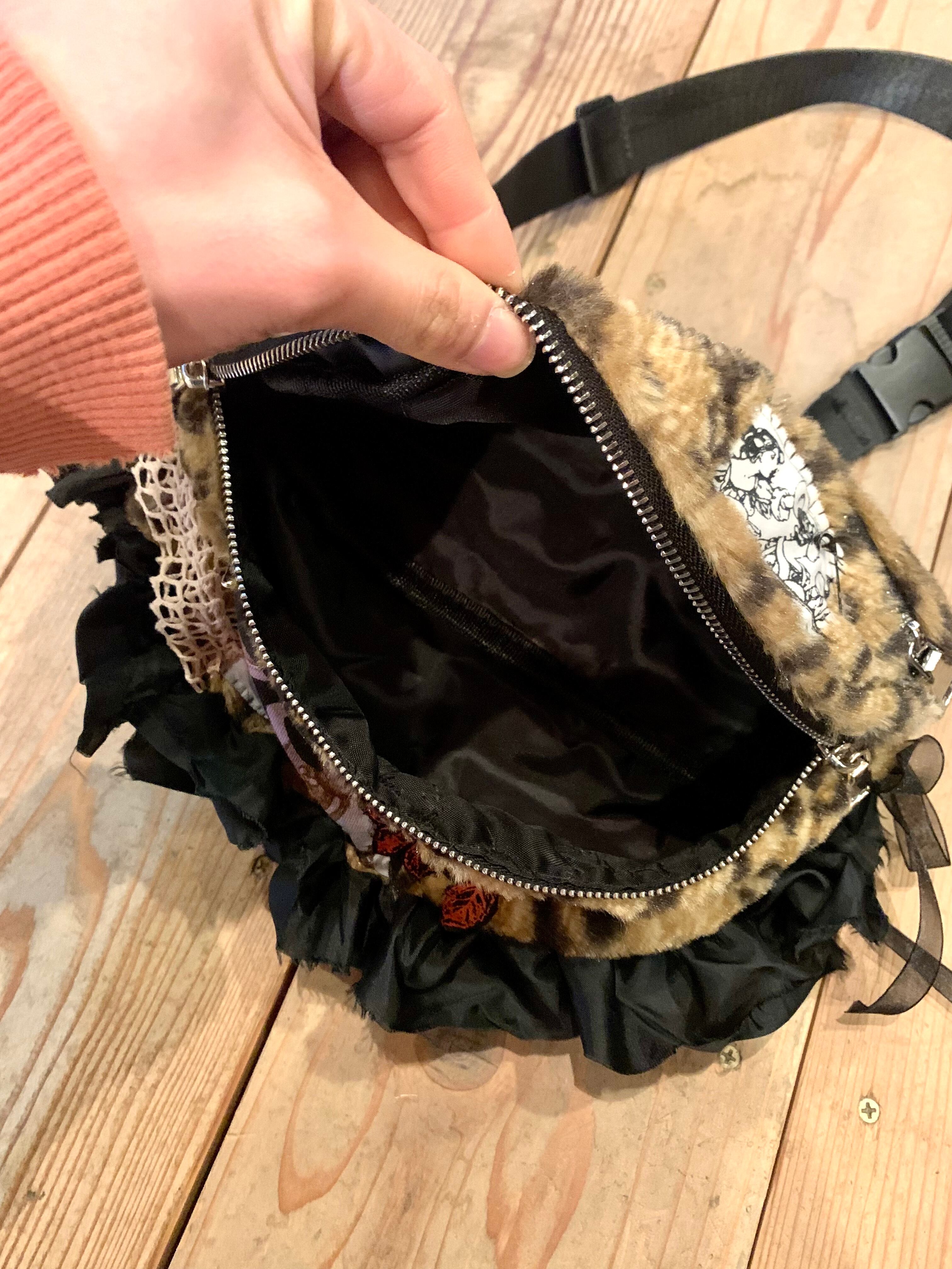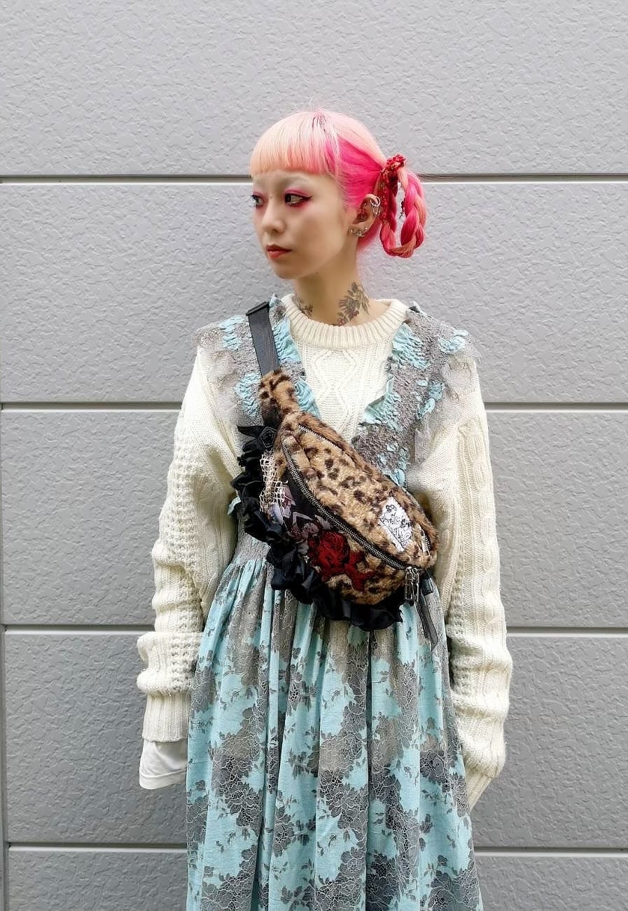 フリルやリボンや安全ピンを付け、シルクスクリーンで刷ったパッチを縫い付けました。