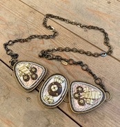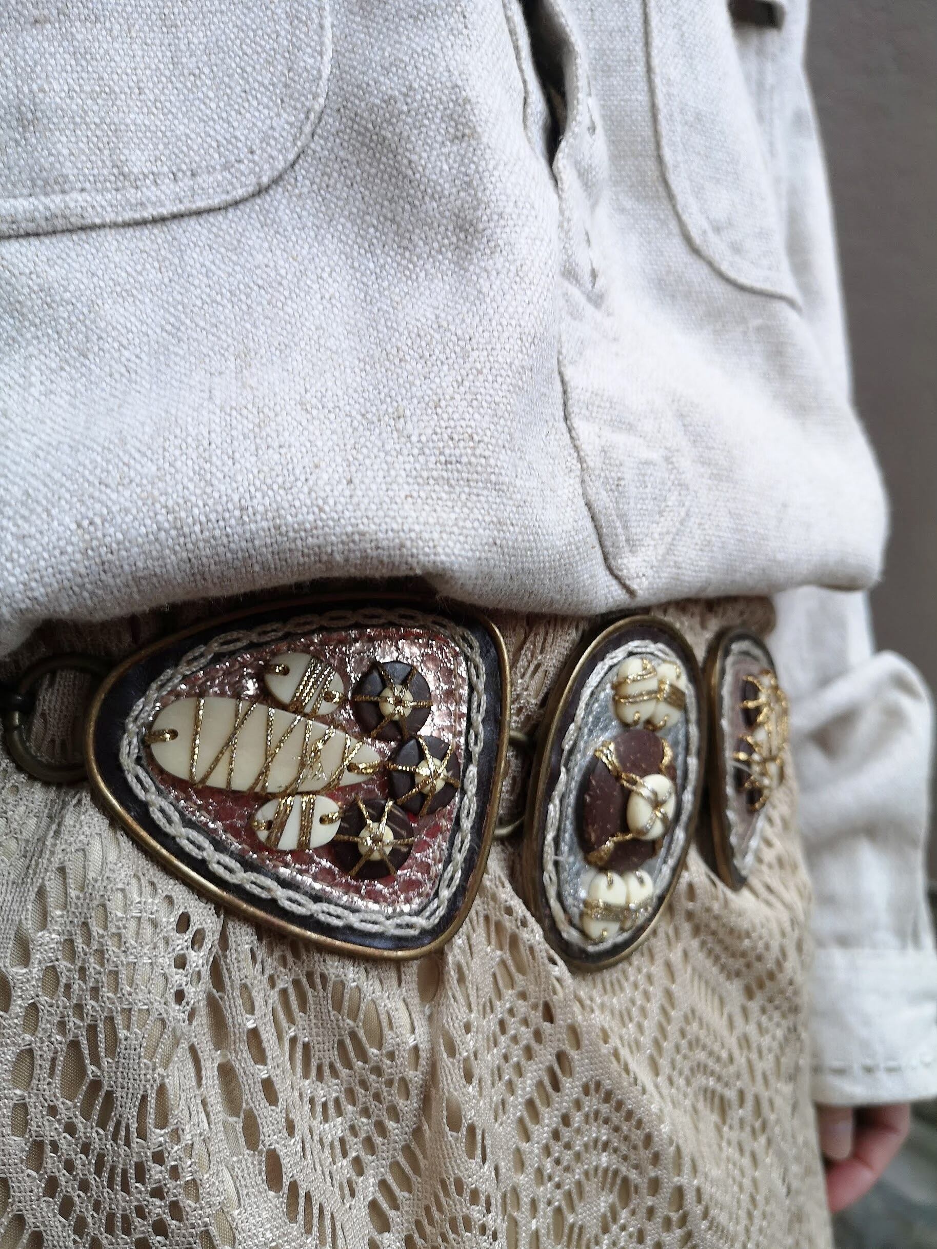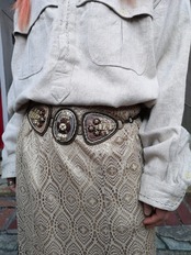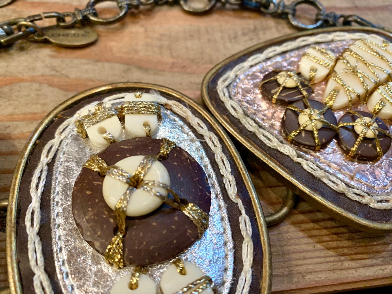 バックル部分はレザーや石の様な物を刺繍糸で張り付けてあるデザイン