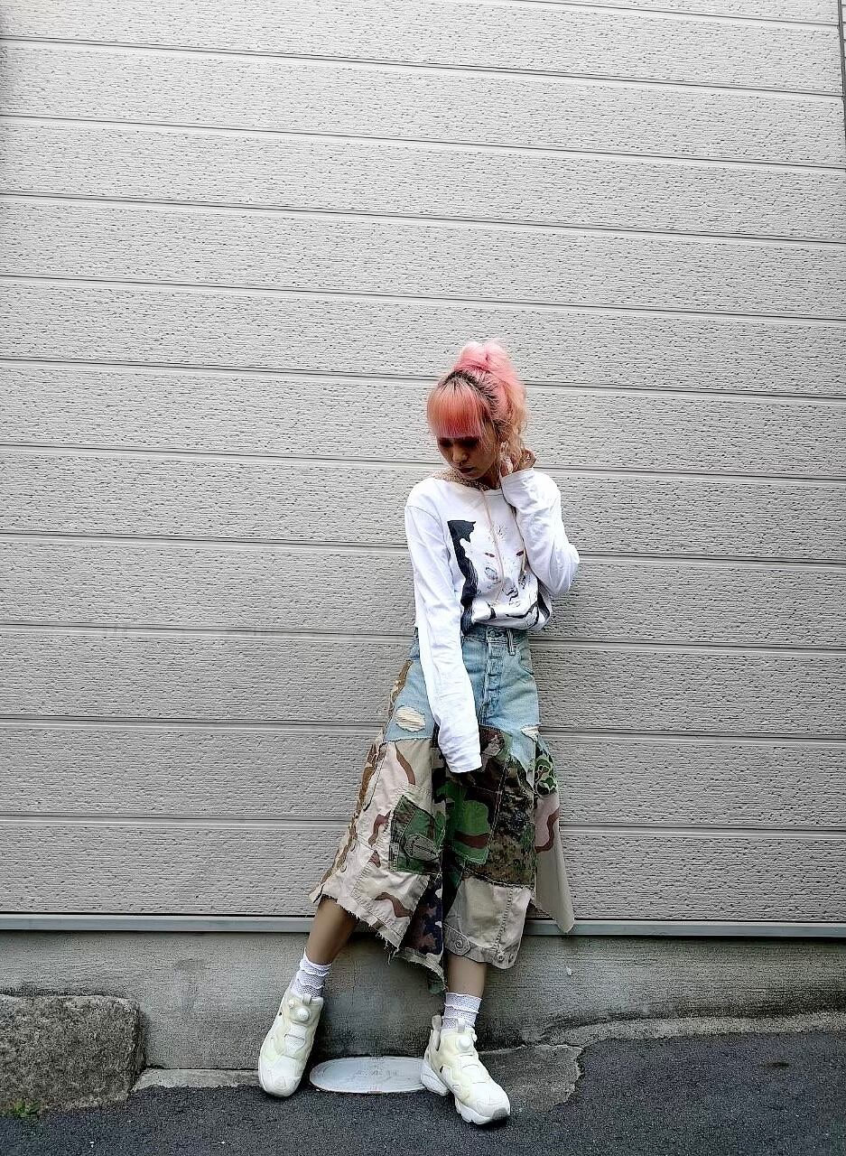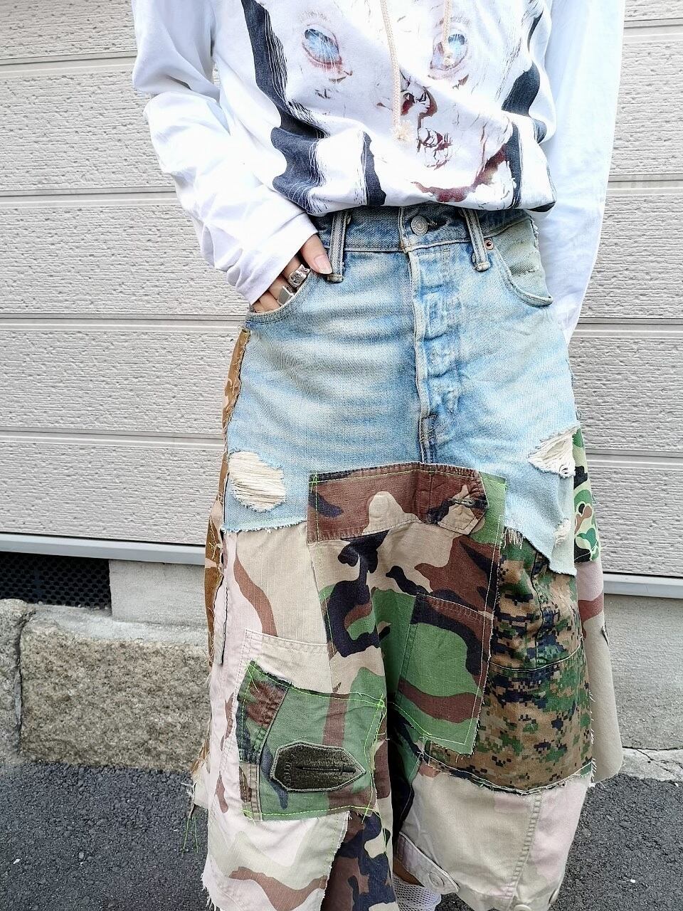 デニムにミリタリー(迷彩柄)の生地を使いスカートを作りました!